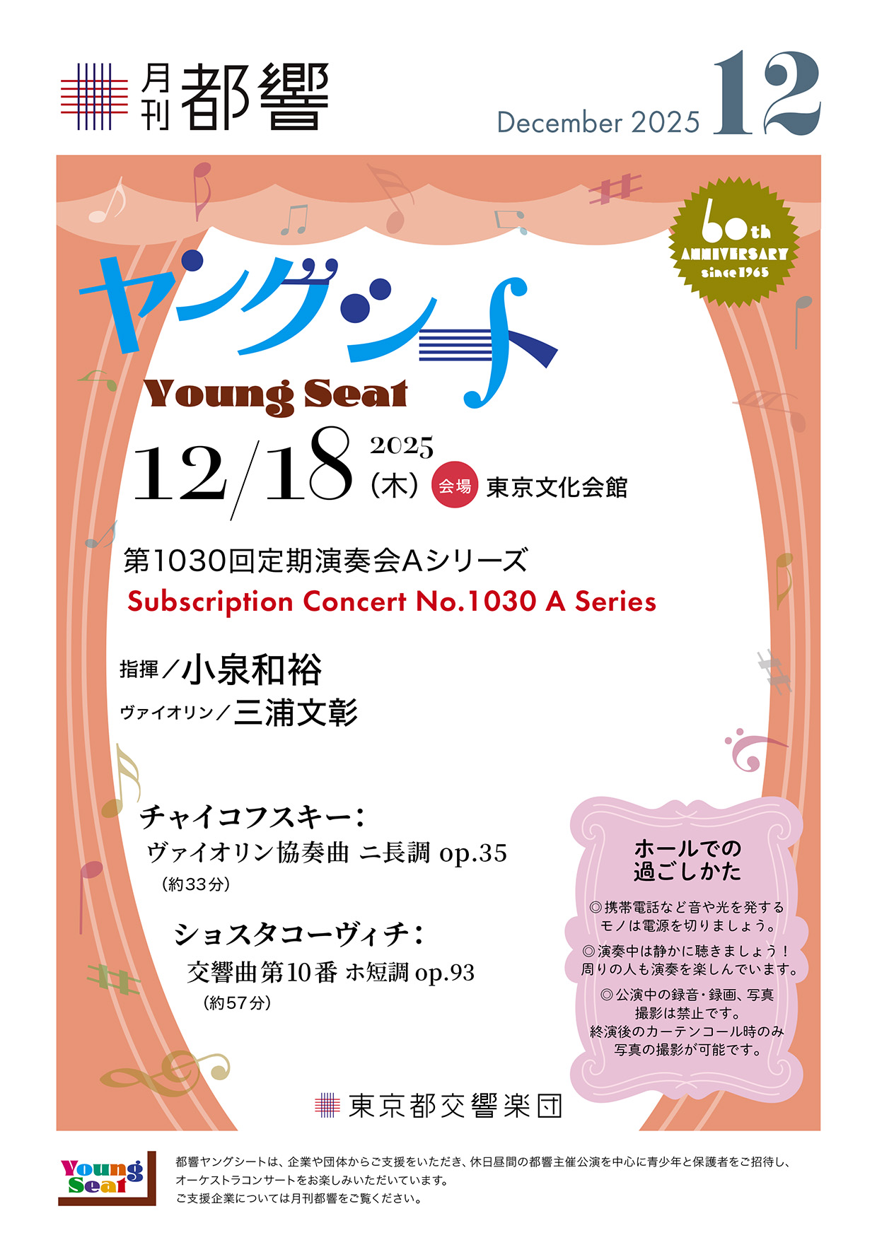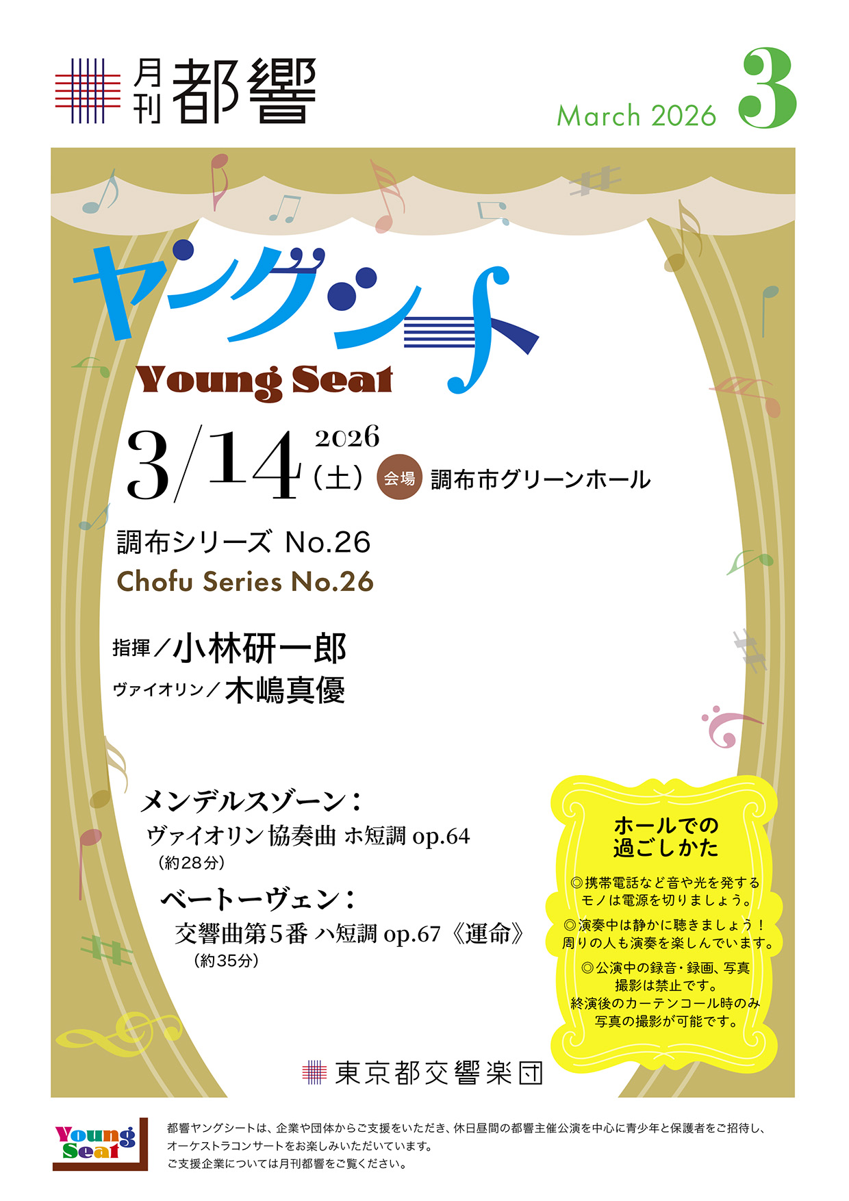 東京都交響楽団では、より多くの青少年の皆さんにオーケストラの生演奏による感動を味わっていただくために、休日昼間を中心とした主催公演に『ヤングシート』を設置し、青少年の皆さんをご招待しております。(招待対象:小学4年生から高校3年生までと保護者)