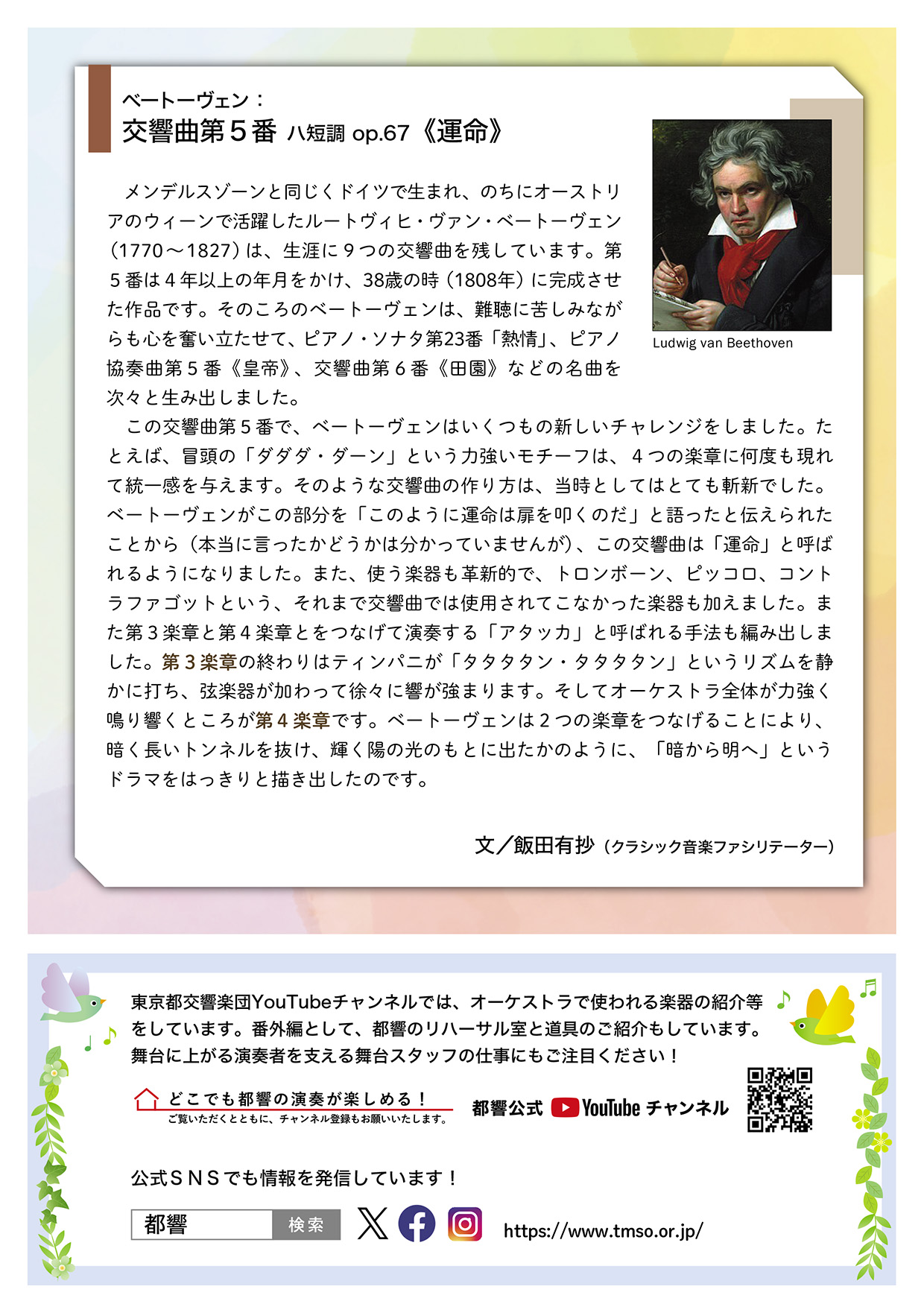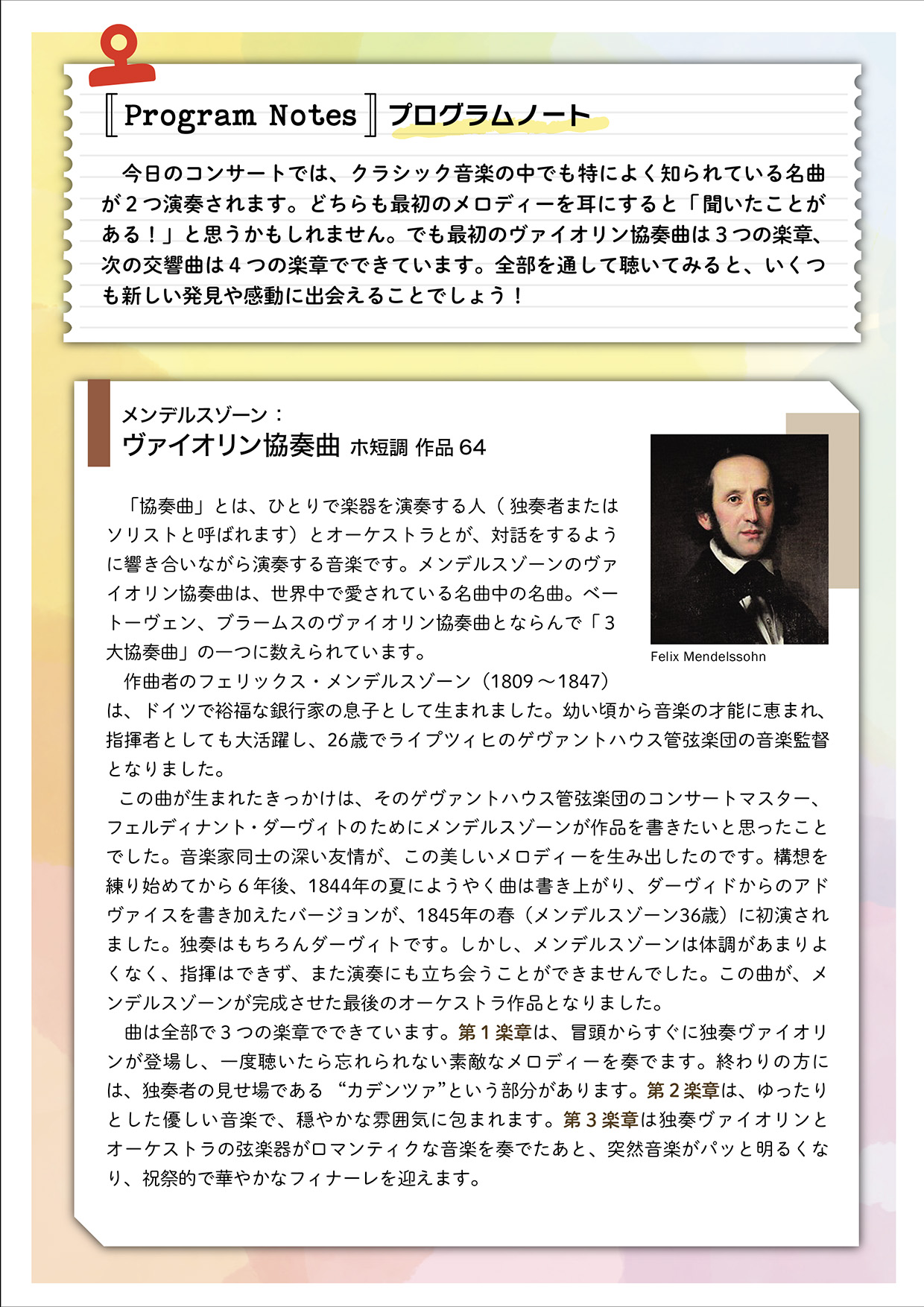 今回のコンサートでは、クラシック音楽の中でも特によく知られている名曲が2つ演奏されます。どちらも最初のメロディーを耳にすると「聴いたことがある!」と思うかもしれません。でも最初のヴァイオリン協奏曲は3つの楽章、次の交響曲は4つの楽章です。全部を通して聴いてみると、いくつも新しい発見や感動に出会えることでしょう!開演前のホールを大公開!