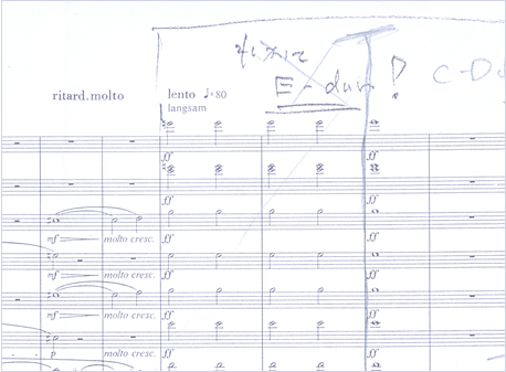 写真⑩の特徴的な文字は若杉弘氏の直筆です。1999年R. シュトラウス特集で『エレクトラ』の抜粋を演奏した時のもので、「もしかしてE Dur!→×やっぱりC Dur!」とリハーサル中に二転三転した、いかにも若杉氏らしい痕跡です。